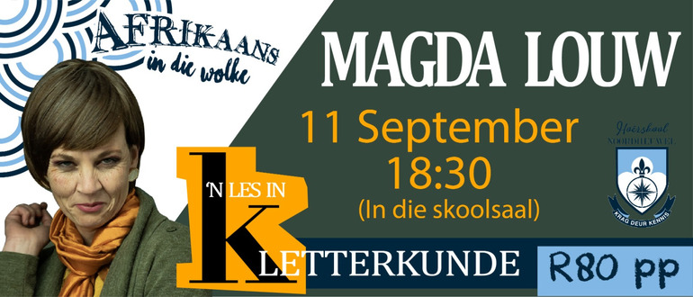 Magda Louw, 11 September om 18:30, bied "‘n Les in Letterkunde" aan. Kom skater saam. Koste: R 80-00 p.p.