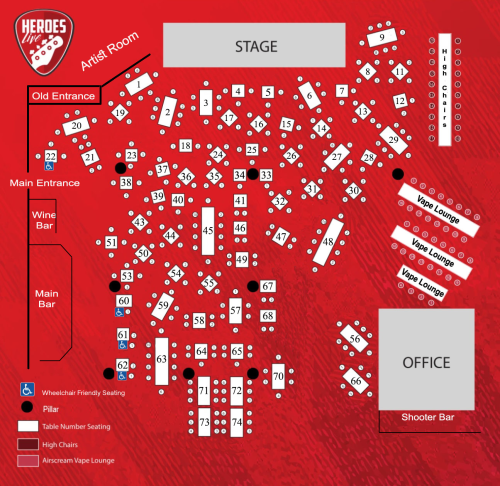 Let ook dat die High Chairs area ‘n hoë ingeboude tafel is met bar stoele wat as “shared seating” verkoop word, hierdie is lekker vir die partytjiegangers wat daarvan hou om bietjie te staan of te dans tydens die vertoning.