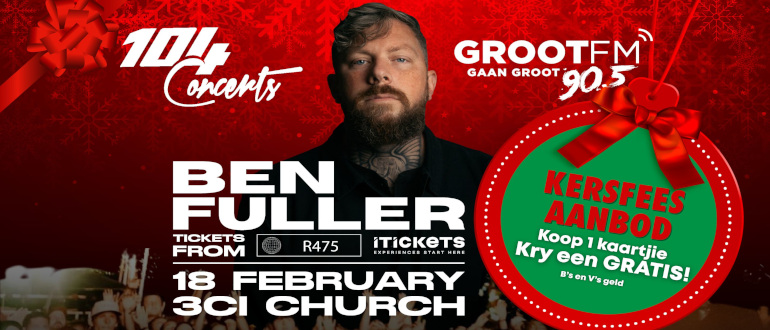 Ben Fuller, Amerikaanse gospelsanger, kom vir die eerste keer in Suid-Afrika optree. Wees deel van 'n onvergeetlike aand van uitstekende musiek, maar ook waartydens hy onbeskaamd sy storie deel van hoe God hom op dramatiese wyse gevind het. Na 'n 14-jaar lange stryd met verslawing vertel hy van die hoop wat hy in Jesus gevind het deur sy musiek. Sy debuut-enkelsnit, "Who I Am" het no. 1 op verskeie Christelike radiotrefferslyste bereik.